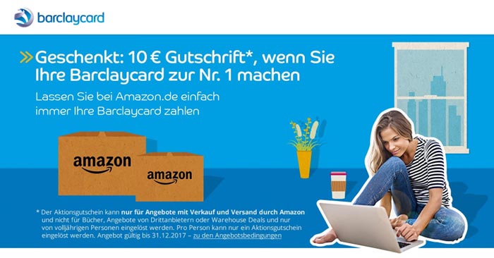 - 10€ Amazon Gutschein geschenkt, wenn Sie die Barclaycard als bevorzugte Zahlungsart hinterlegen