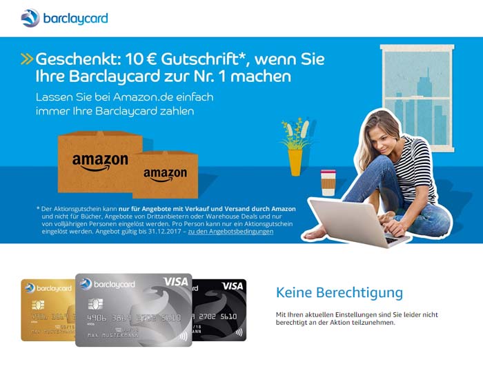 Bei Amazon gibt es eine sehr gute Barclaycard Aktion, bei der Sie einen 10€ Amazon Gutschein erhalten, wenn Sie Ihre Barclaycard Kreditkarte als bevorzugtes Zahlungsmittel hinterlegen. Die Aktion gilt nur für berechtigte Amazon Mitglieder, die eine Bannerwerbung angezeigt bekommen haben, doch dies lässt sich durch einen kleinen Trick einfach umgehen. Rufen Sie die Aktion auf und wenn dort „Nicht berechtigt“ steht, gehen Sie auf die Startseite und klicken unten rechts auf den Barclaycard Banner, der Ihnen nach ein paar mal aktualisieren angezeigt wird.