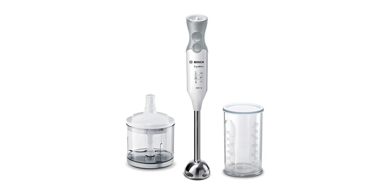 Der Bosch ErgoMixx Stabmixer verfügt über 600 Watt und 12 Geschwindigkeitsstufen. Ihr könnt damit Babybrei, Pesto, Suppe, Mayonnaise und vieles mehr herstellen. Mitgeliefert wird ein Mixbecher mit Skalierung und ein VarioChopper zum schnellen Hacken und Zerkleinern von Nüssen, Schokolade, Käse und mehr.