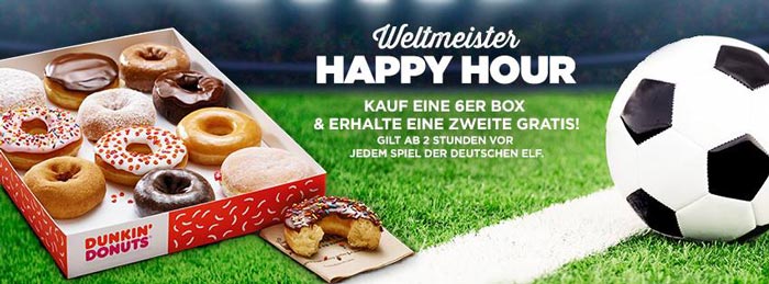 Die sogenannte Weltmeister Happy Hour von Dunkin Donuts gibt es immer nur vor den Spielen der deutschen Fußball Nationalmannschaft und auch nur ab 2 Stunden vor dem Anpfiff. Sie können das Angebot also am 17.06. ab 15 Uhr, am 23.06. ab 18 Uhr oder am 27.06. ab 14 Uhr nutzen. Sollte Deutschland über die Vorrunde hinaus kommen, gilt es natürlich weiterhin auch im Achtelfinale, Viertelfinale, Halbfinale oder Finale.