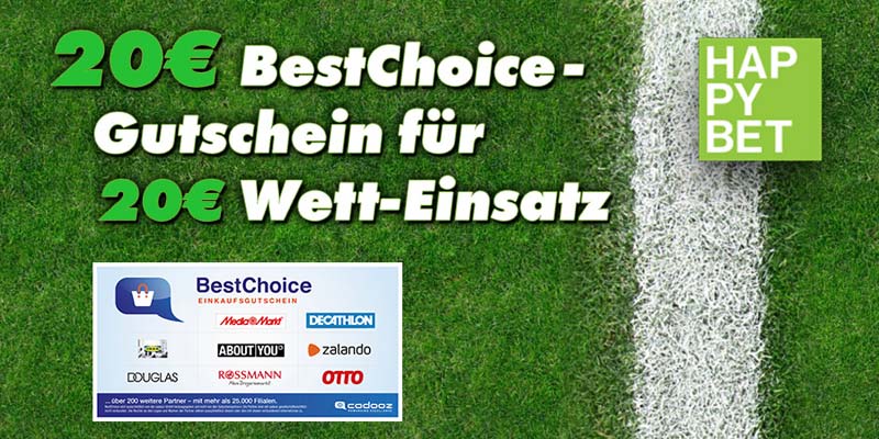 Heute haben wir mal wieder einen richtig guten Sportwetten Bonus für euch. Wenn ihr euch über unsere Bonus-Deals bei Happybet als Neukunde anmeldet, anschließend mindestens 20€ einzahlt und eine Wette über mindestens 20€ platziert, gibt es von uns einen 20€ BestChoice- oder Amazon Gutschein als Happybet Sportwetten Bonus geschenkt. Somit macht ihr effektiv keinen Verlust, auch wenn die Wette verloren gehen sollte. Vielleicht habt ihr ja auch Glück und gewinnt die Wette.
