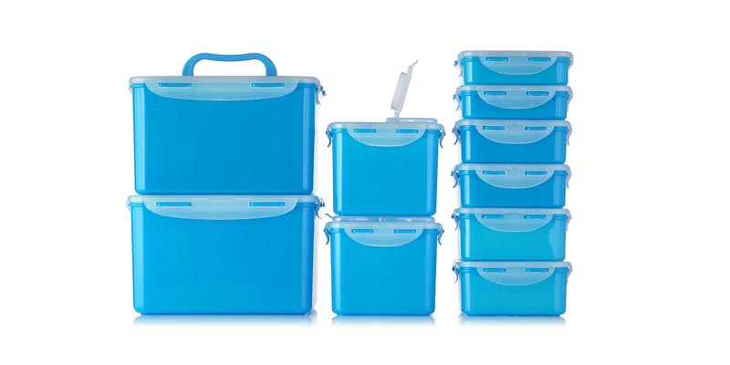 Insgesamt besteht das Lock & Lock Frischhaltedosen-Set aus 10 Boxen. Es besteht aus 10 rechteckigen Dosen mit je 360, 460, 600, 1000 und 4500 ml Volumen.