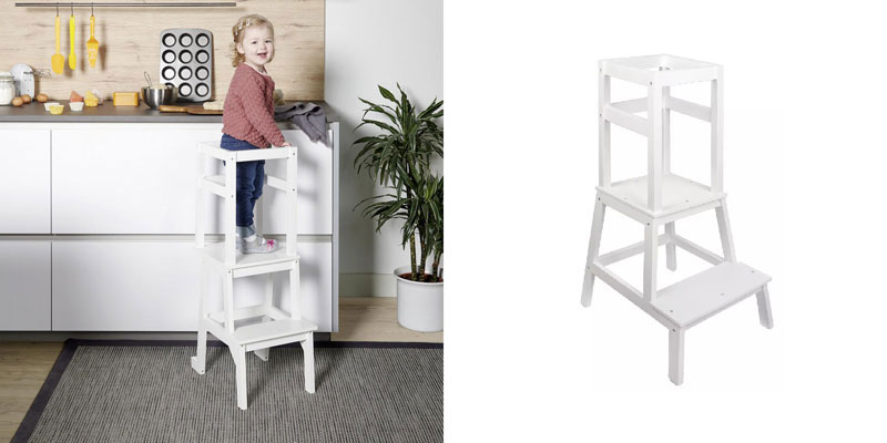 Der Lernturm ist bis zu 50 kg belastbar und für Kinder ab 3 Jahren geeignet. Er besteht aus Kiefernholz und ist weiß lackiert. Der Turm ist 50,5 cm breit, 42cm tief und 91,8 cm hoch (inklusive Gitter). Somit können eure Kinder bequem und sicher in der Küche zuschauen oder gleich mithelfen und dabei eine Menge lernen und vor allem Spaß haben.