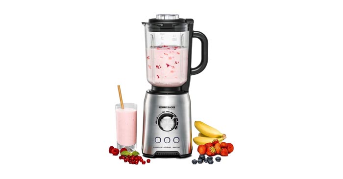 Der Rommelsbacher Standmixer MX 1250 hat ein Gehäuse aus Edelstahl und kommt mit 22.000 Umdrehungen pro Minute daher. Die Drehzahl könnt ihr stufenlos regulieren und bei 1200 Watt und 22.000 Umdrehungen sollte euer Smoothie, Sauce, Pesto, etc. sehr fein werden. Über die separaten Funktionstasten Ice Crush, Smoothie, Clean/Pulse kann der Mixer nach euren Belieben gesteuert werden. Der Behälter besteht aus Glas und kann 1,75 Liter fassen.