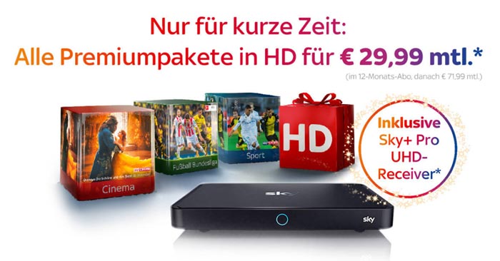 Sky Weihnachtsangebot: Komplettpaket (Sport, Bundesliga, Entertainment & Cinema) inkl. HD & Sky Go für 29,99€/Monat