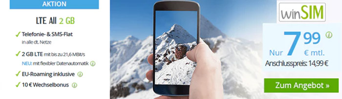 - winSIM LTE All 2 GB Tarif für 7,99€/Monat